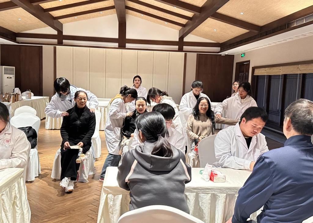 学生们给客人进行手部经络疏通