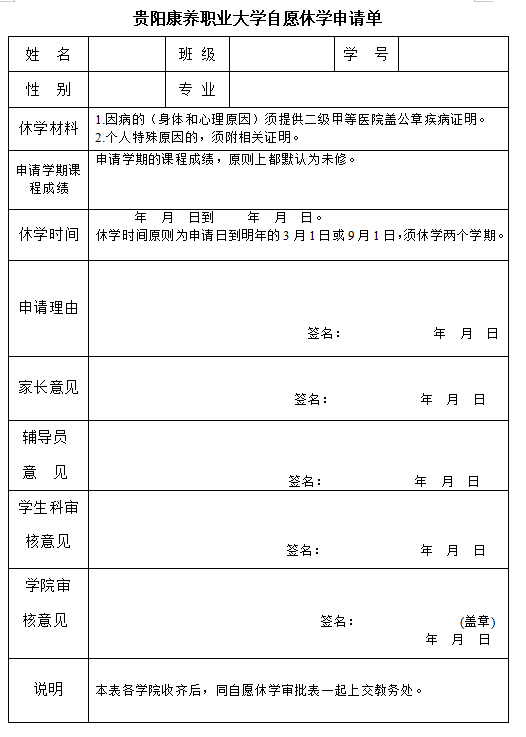 贵阳康养职业大学学生自愿休学申请单